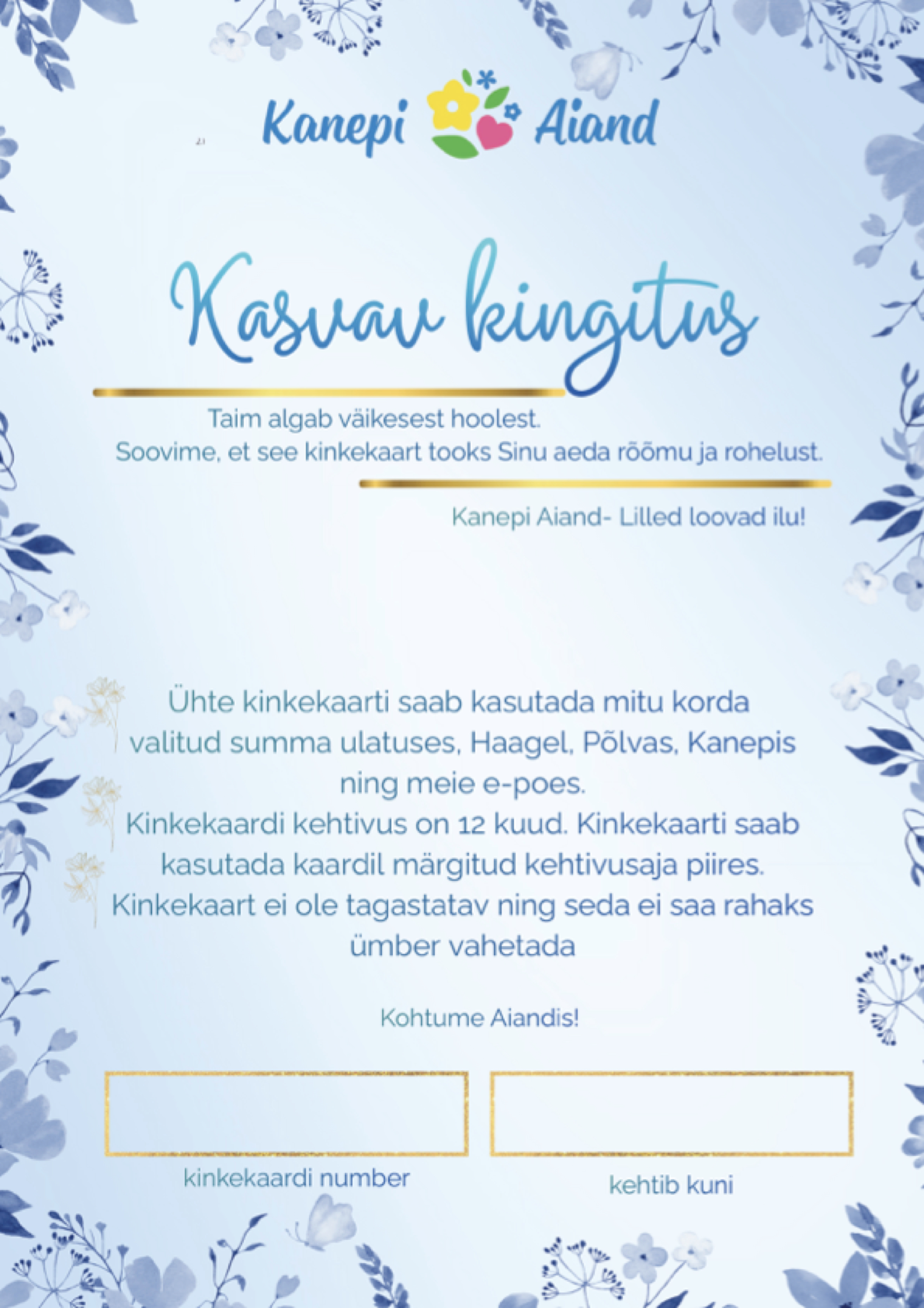 Siin leiad erinevaid võimalusi üllatada oma lähedasi Kanepi Aiandi kinkekaardi või kinkekomplektiga.